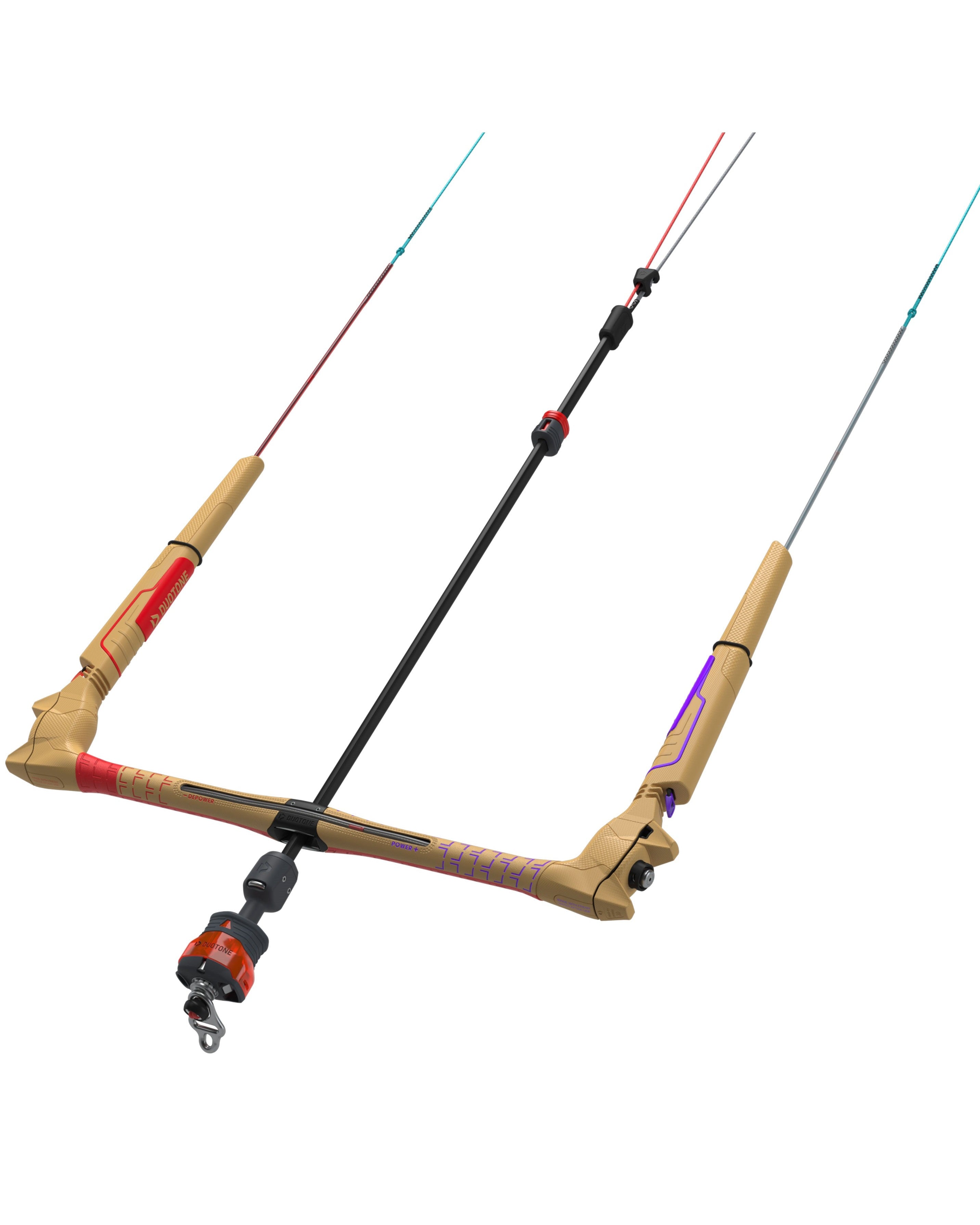 At the heart of the bar is a center part bearing that rotates up to +30° with the depower line. This keeps the entire bar rotating smoothly, even under load, improving steering comfort. The strong metal V-split ring acts as a kind of V-Distributor: easy to (dis)assemble and prevents line tangling. The low V option makes the bar compatible with almost every kite on the market, from Duotone to other brands. Safety has also been carefully thought out. The Iron Heart VI Click-In safety system ensures quick and effortless clicking in and out. The suicide ring allows you to ride in fixed mode, perfect for riders who often ride unhooked. Durability also takes a central role: the EVA grip material now contains 20% BLOOM, a foam made from algae to reduce the use of new plastics. The removable floaters give you the option to easily inspect the internal lines for wear, and the minimalist pigtails are sleeved only where it’s really necessary. This keeps your setup light, safe, and durable.